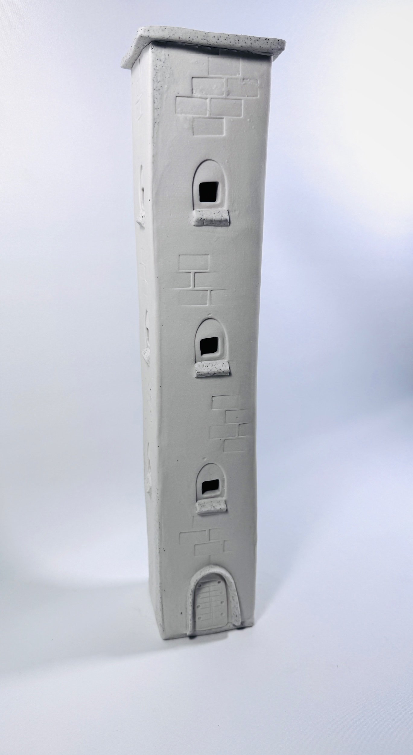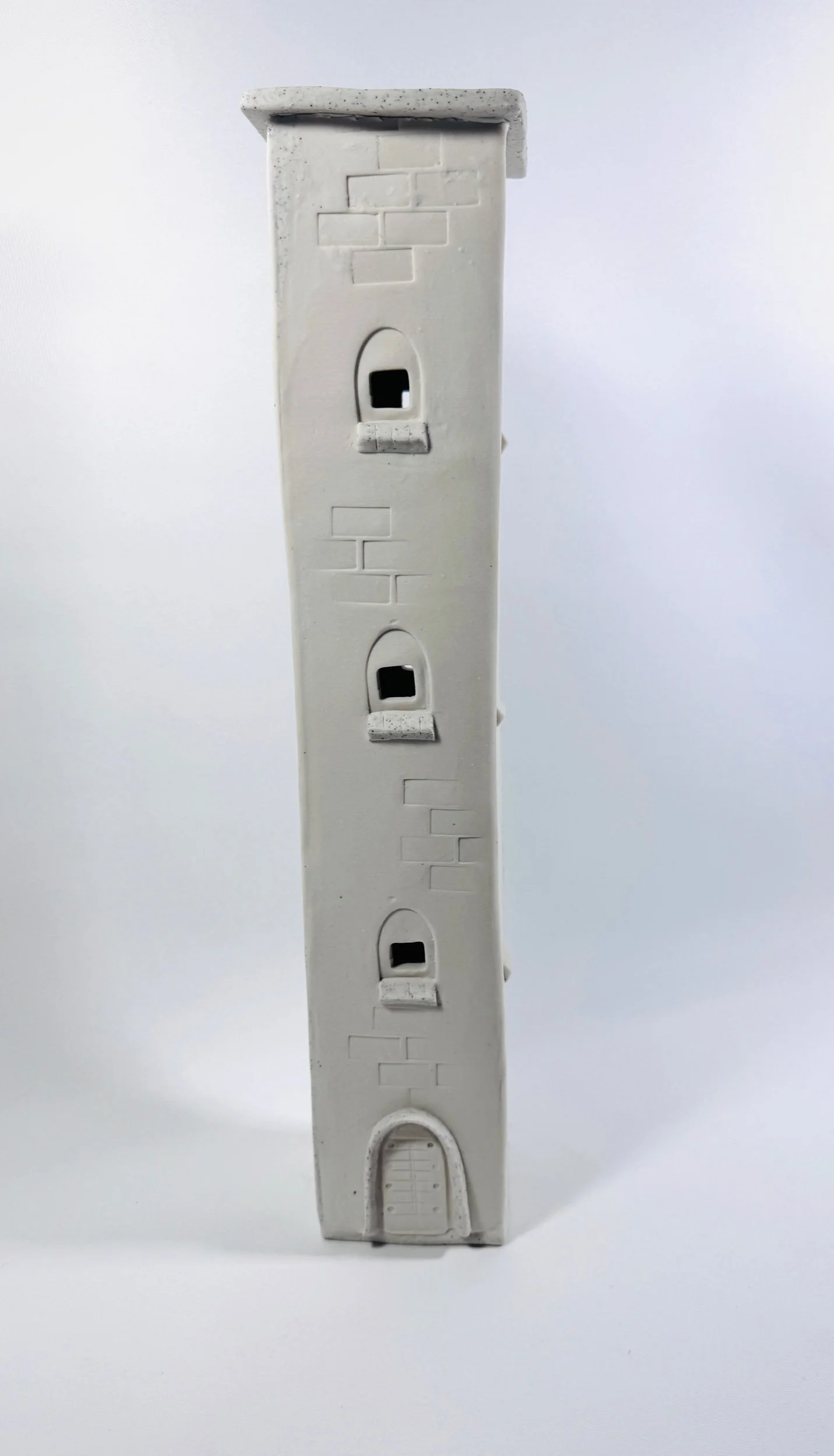 A character filled ceramic tower made with a mix of speckled and white clay. Great on it’s own, as a candle holder or in a group to make a city scape.
