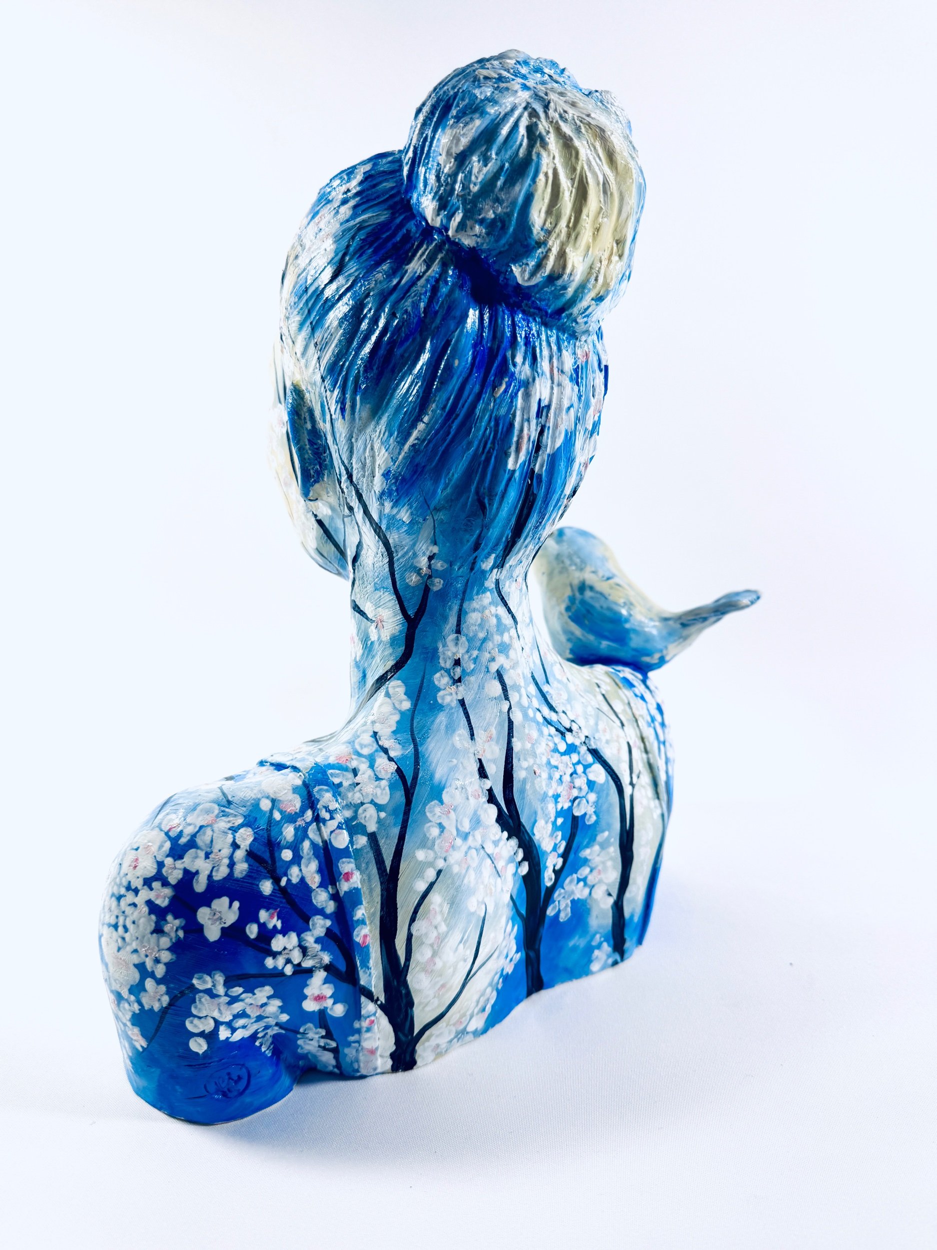 The petite little lady covered with blossoms looks thoughtful. Sculpted from porcelain clay and hand painted using artist oil paints to break tradition and provide texture and detail that glazes can’t do. I love the little bird sitting on her shoulder looking at her with real curiosity. One of a kind, this piece should be kept indoors or very well protected from any damaging weather.
