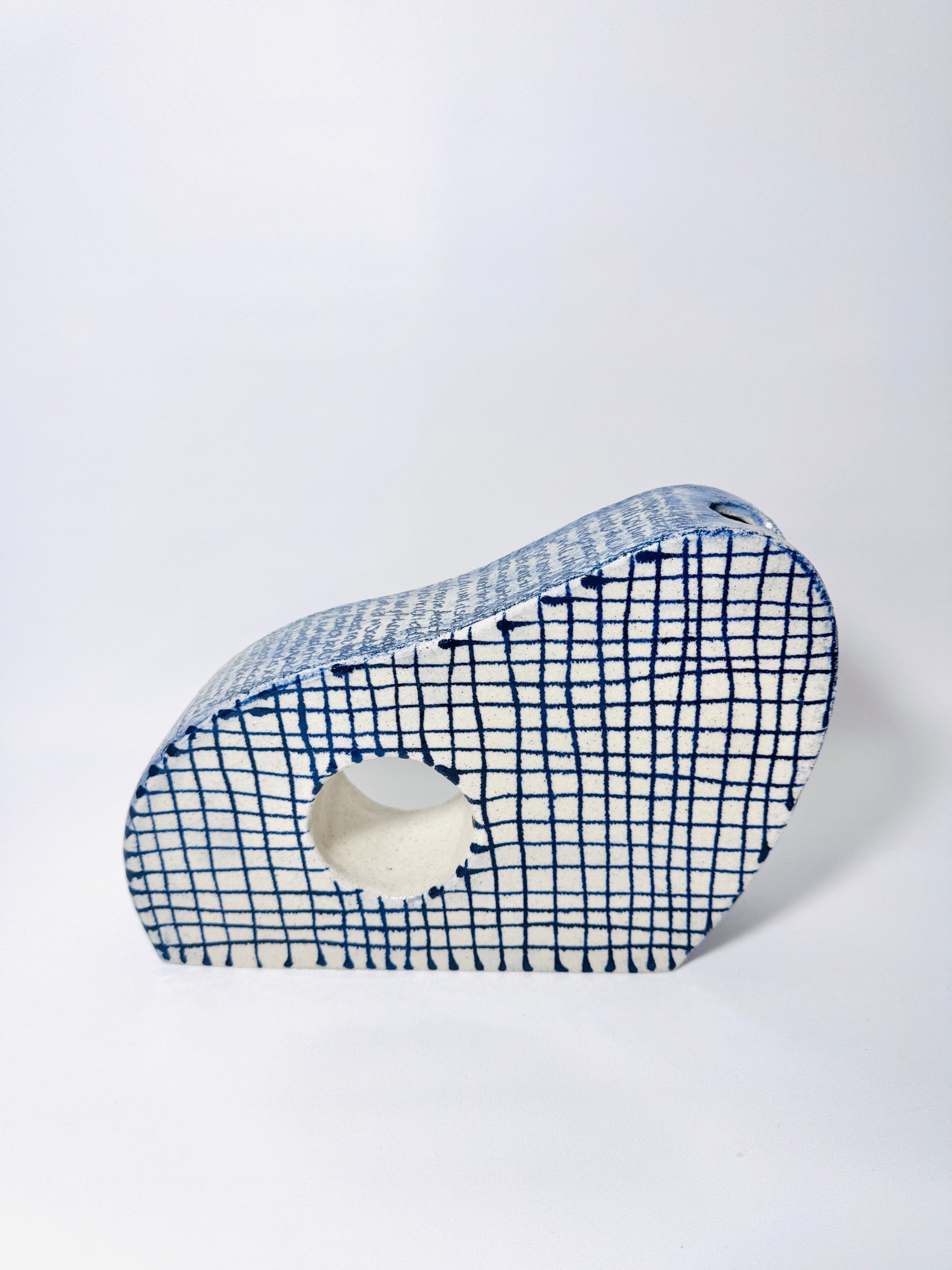 his large sculptural vase features a striking cobalt-blue grid pattern with hand-painted calligraphy along its edges, giving the form a dynamic sense of movement and detail. Its organic silhouette and cut-out openings create a bold architectural presence, whether displayed alone or paired with its complementary vessel.