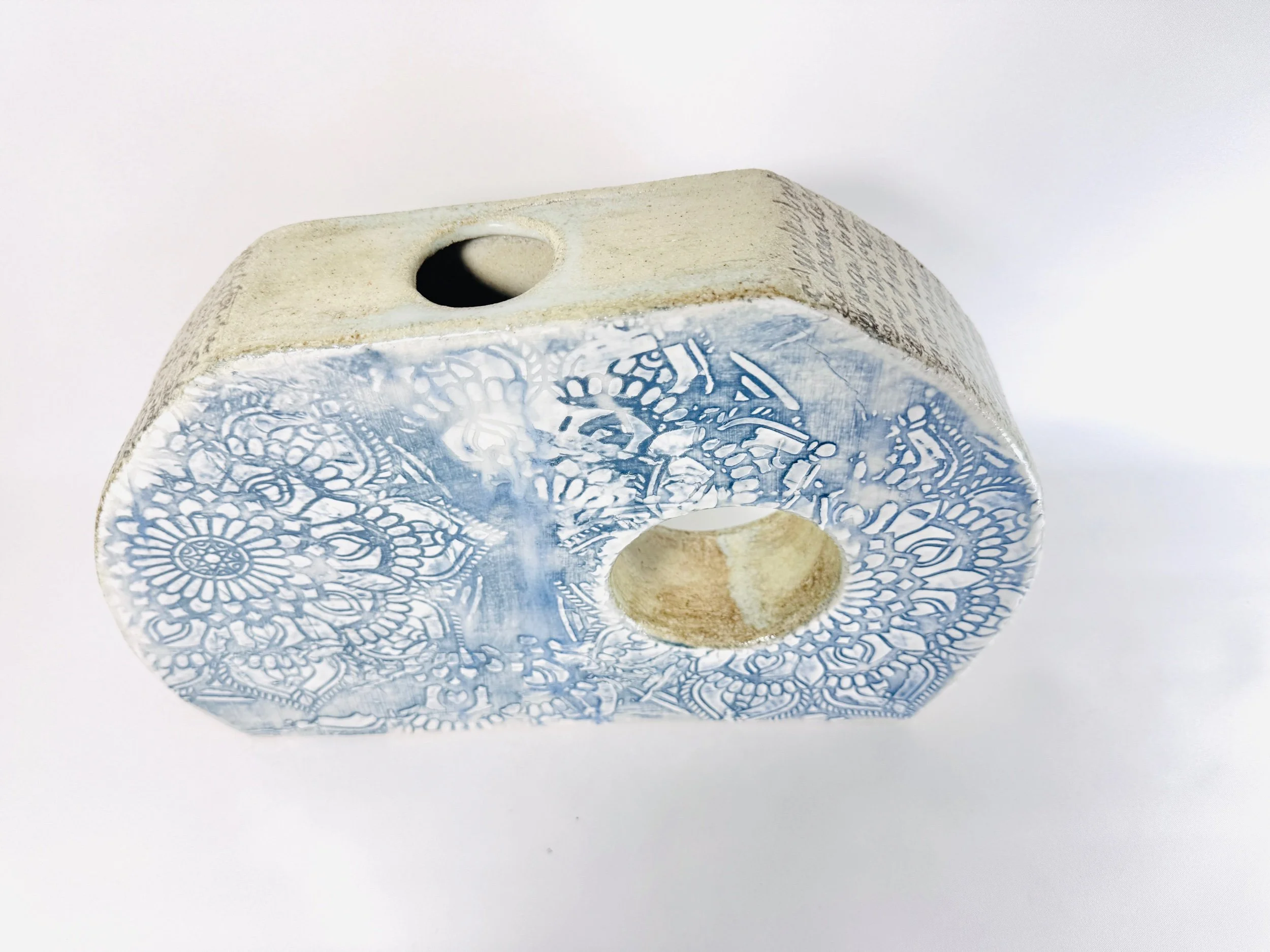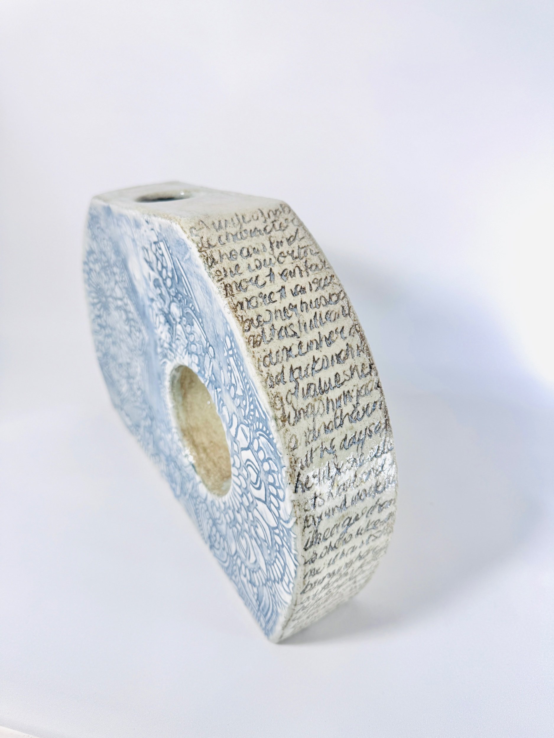 This sculptural ceramic vase features delicate blue lacework impressed across its surfaces, paired with handwritten script along the edges for added depth and detail. Its organic silhouette and circular opening give the piece a refined, architectural presence, making it a striking standalone artwork or a vase for a light display of dried flowers.