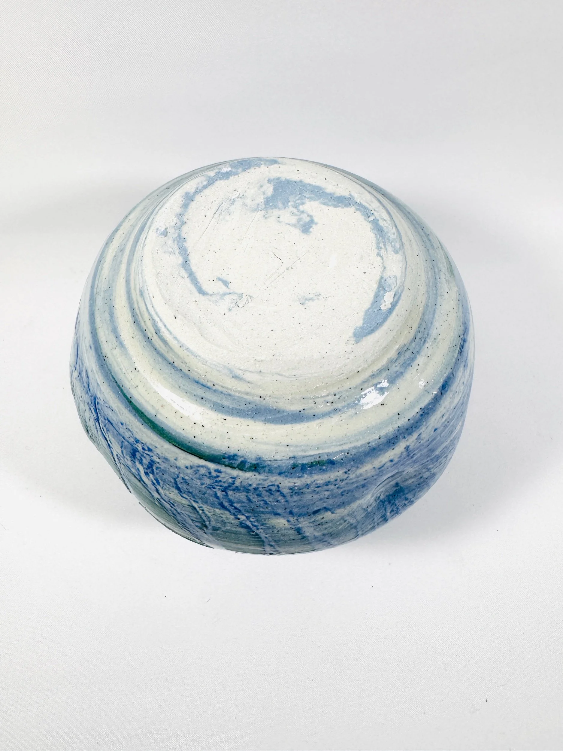 This expressive ceramic vase features a gently squashed form and layered blue tones that evoke shifting water and coastal textures. Its organic shape and painterly surface make it a striking standalone piece or a distinctive vessel for a simple floral arrangement