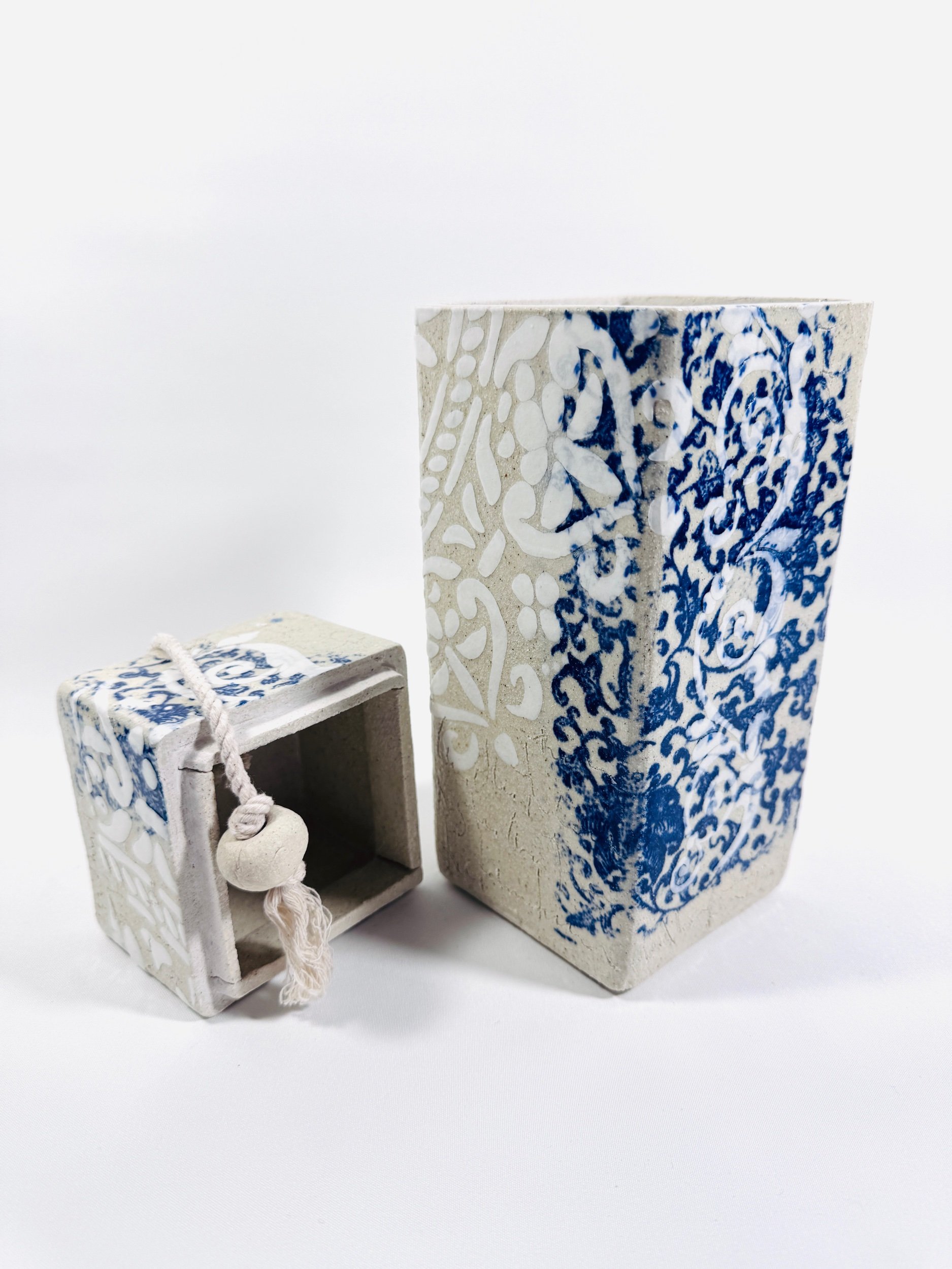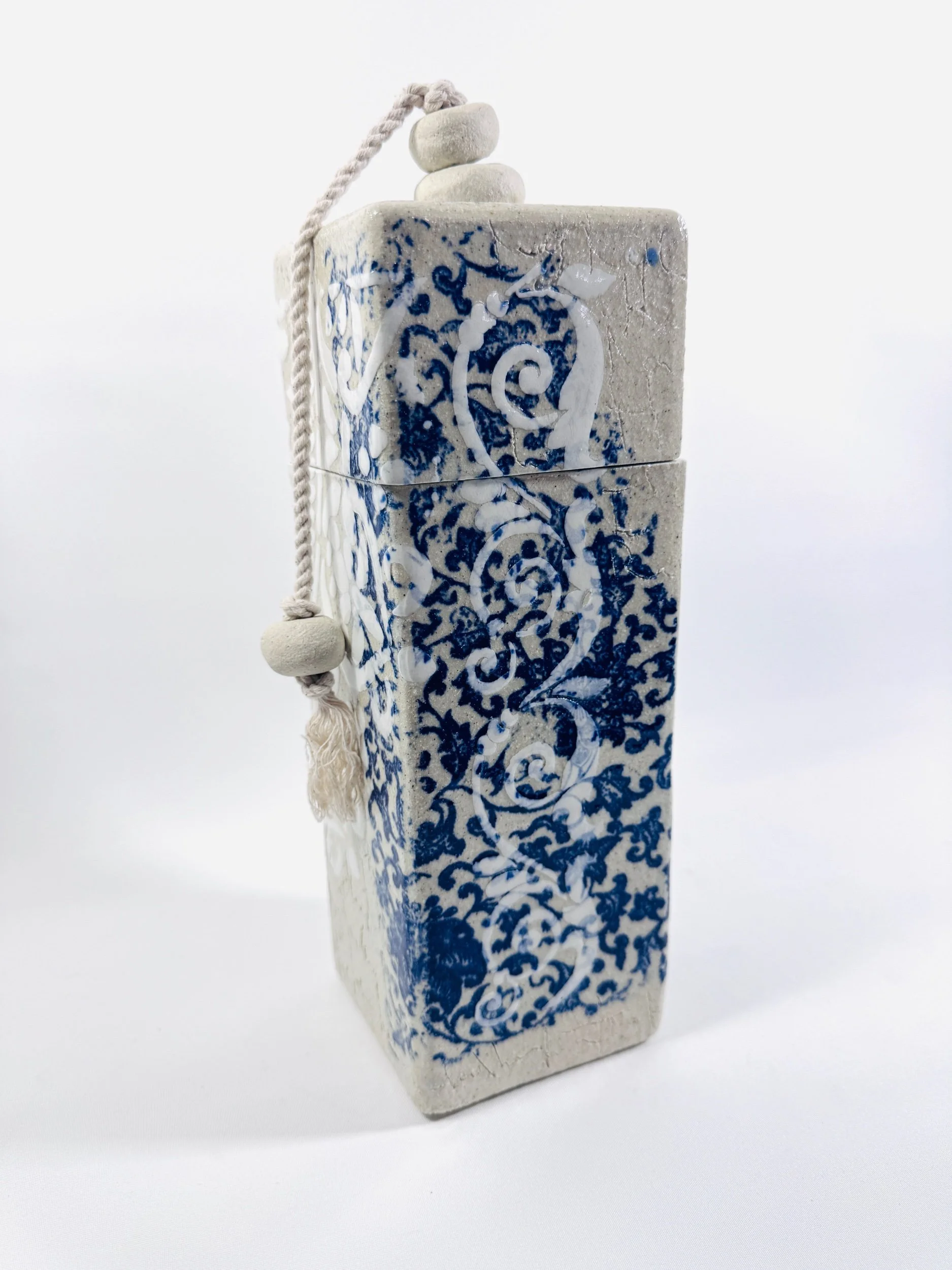 Rustic to touch and delicate in decoration, this unusual treasure box is lidded with ceramic beads. Hand made with raku white clay layered with porcelain embellishments and underglaze textures.