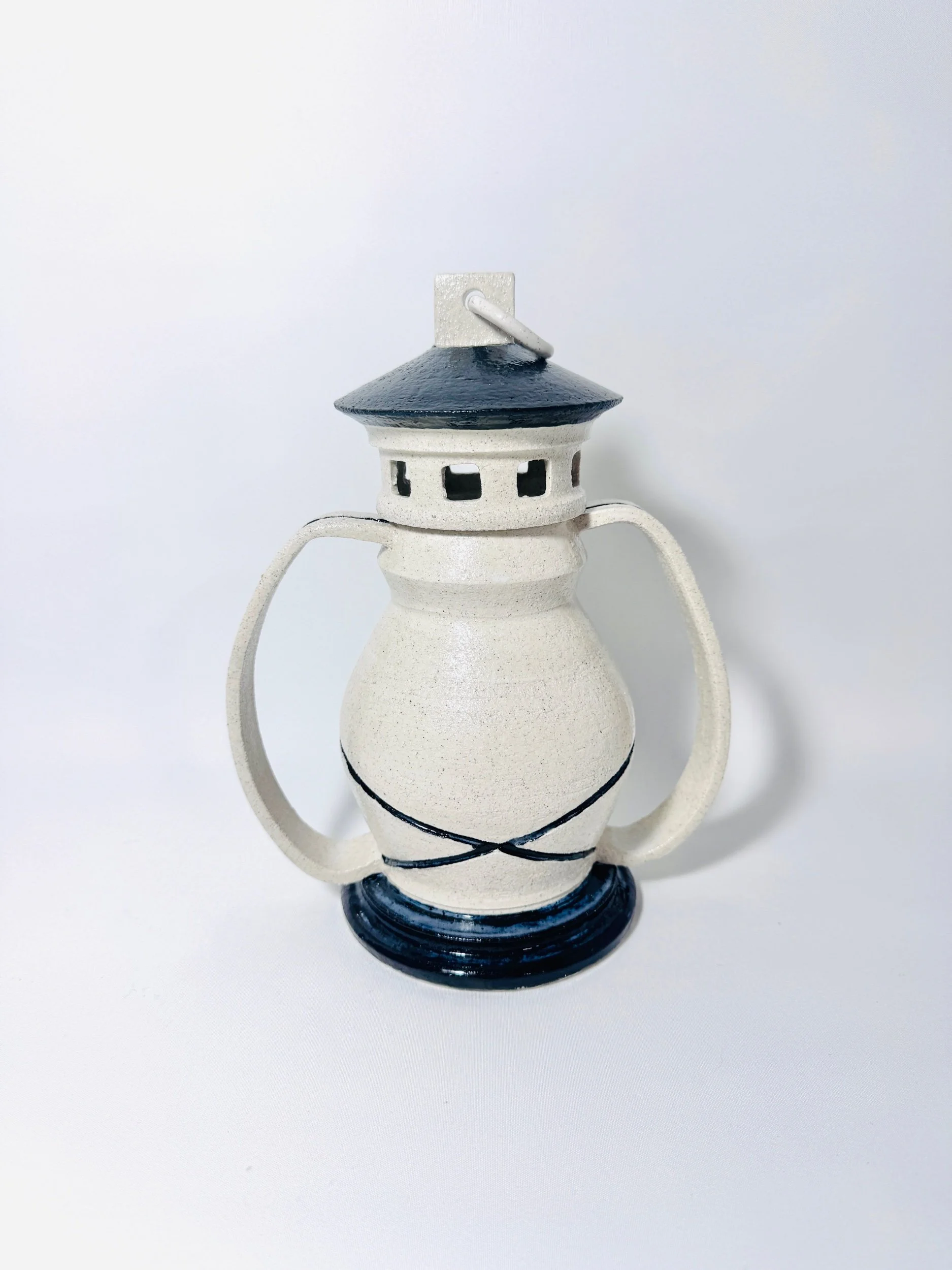 This sculptural ceramic vessel is inspired by an old-fashioned lantern, featuring a softly rounded body, arched handles, and a finely detailed top section reminiscent of a vintage light. Finished in raku white with dark accents, it has a nostalgic yet contemporary presence, making it a standout piece for display.