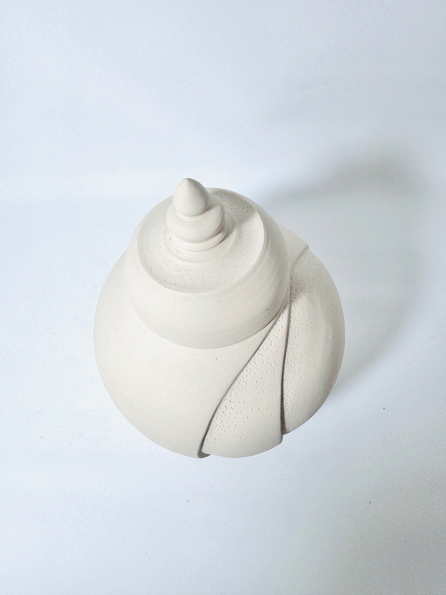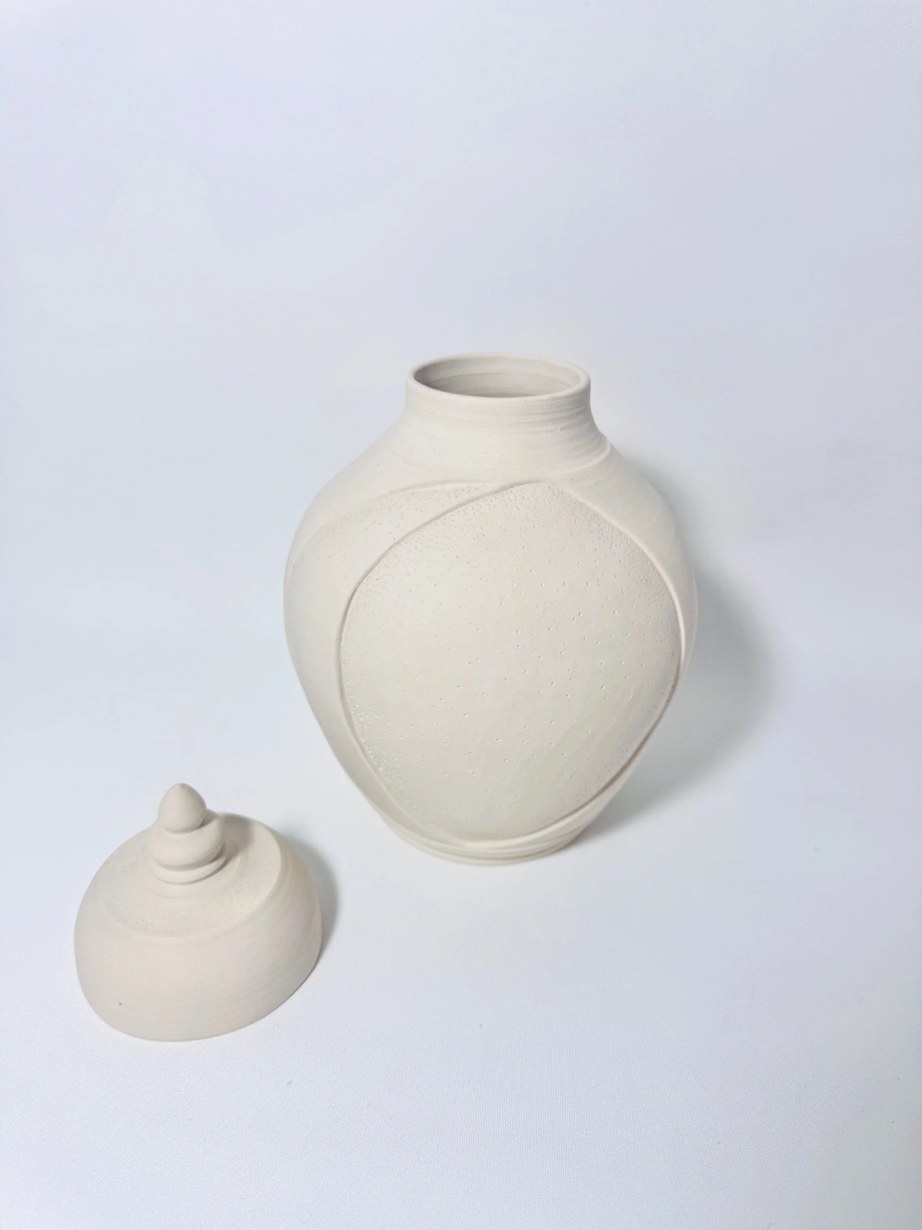 This elegant lidded ceramic form features a softly rounded silhouette with sweeping sculptural panels that wrap gracefully around the body. Originally created as an urn but suitable for any purpose, it offers a refined and timeless vessel for keepsakes, ceremonial use, or quiet decorative display.