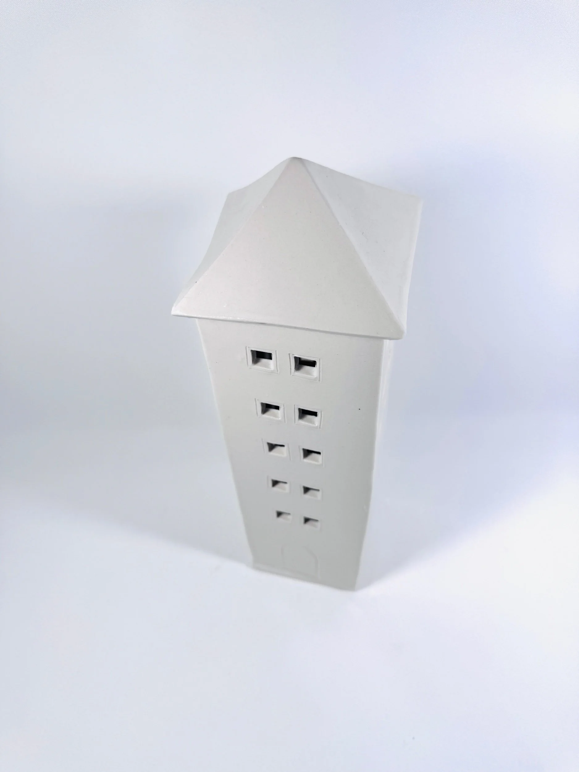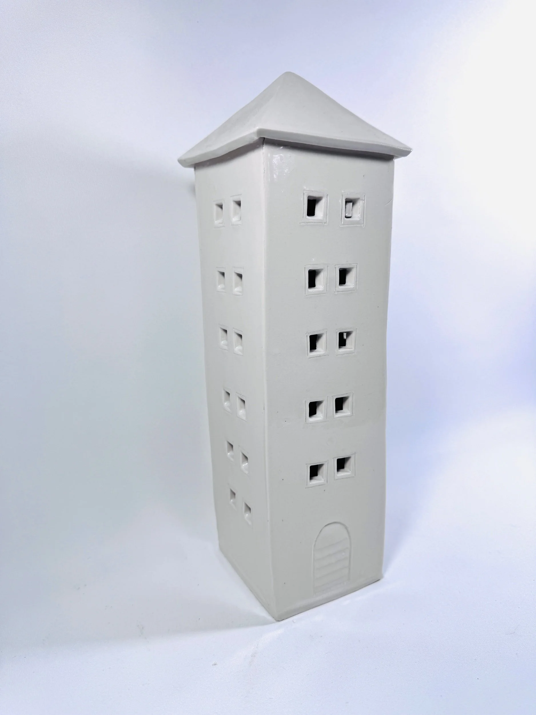 This stylised ceramic building features clean architectural lines and thoughtfully carved windows, creating a quiet sculptural presence. Displayed alone or within a cityscape arrangement, it adds a refined, minimalist touch to any space.