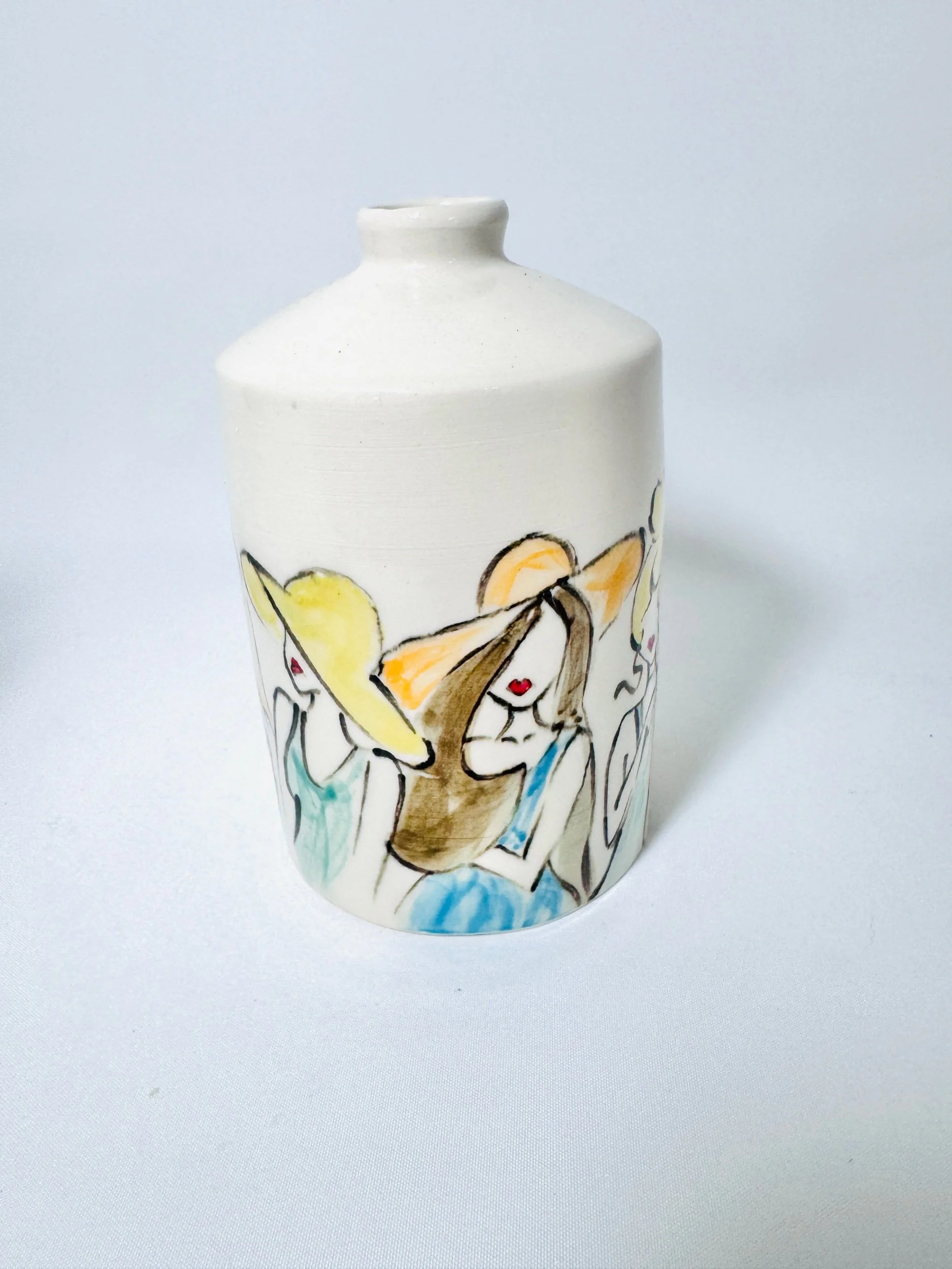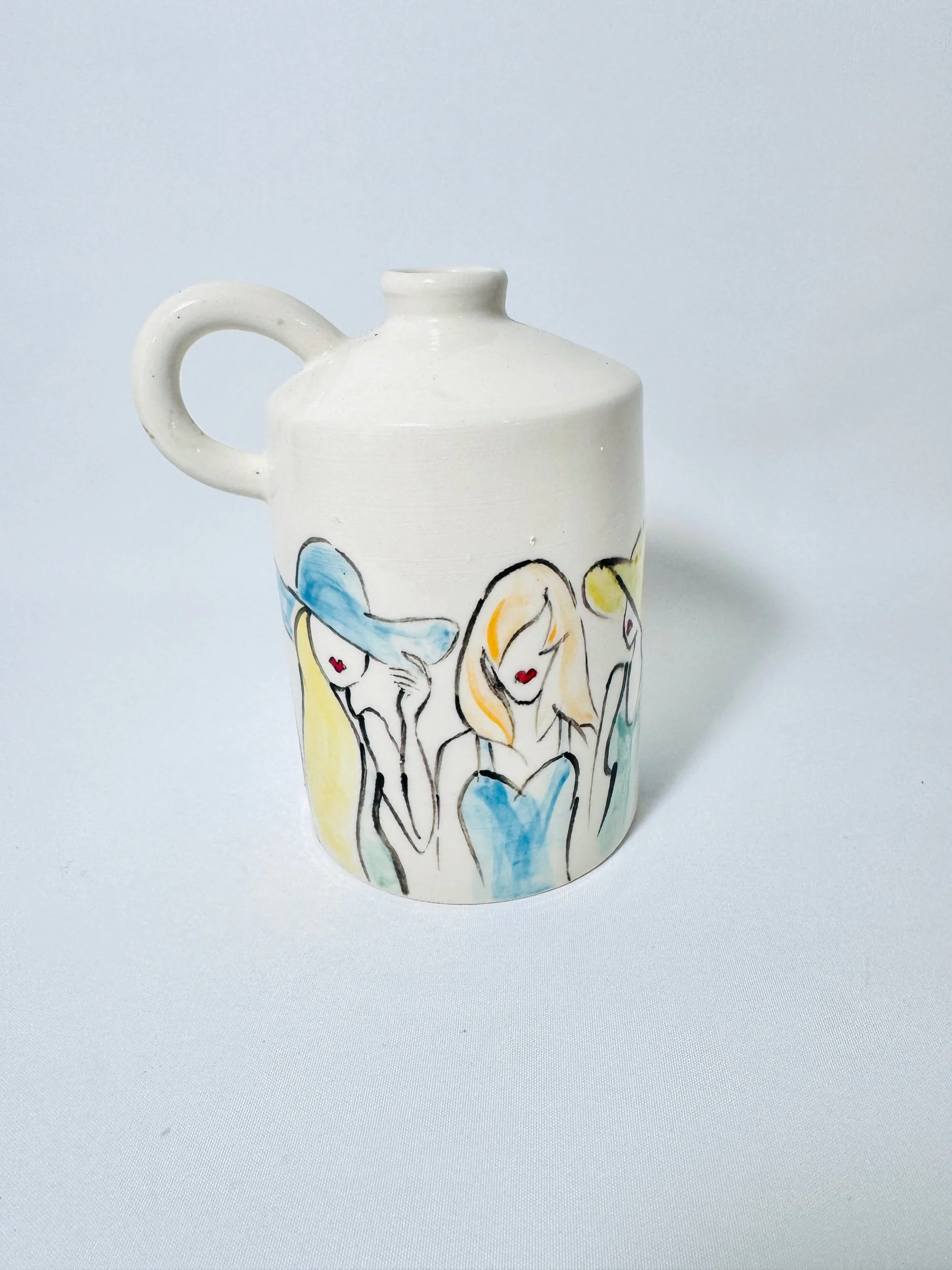 This ceramic jug features a hand-painted illustration of elegant, stylised women in soft washes of colour, giving the piece a lively and contemporary character. Its simple form and expressive artwork make it a charming decorative accent or functional vessel.