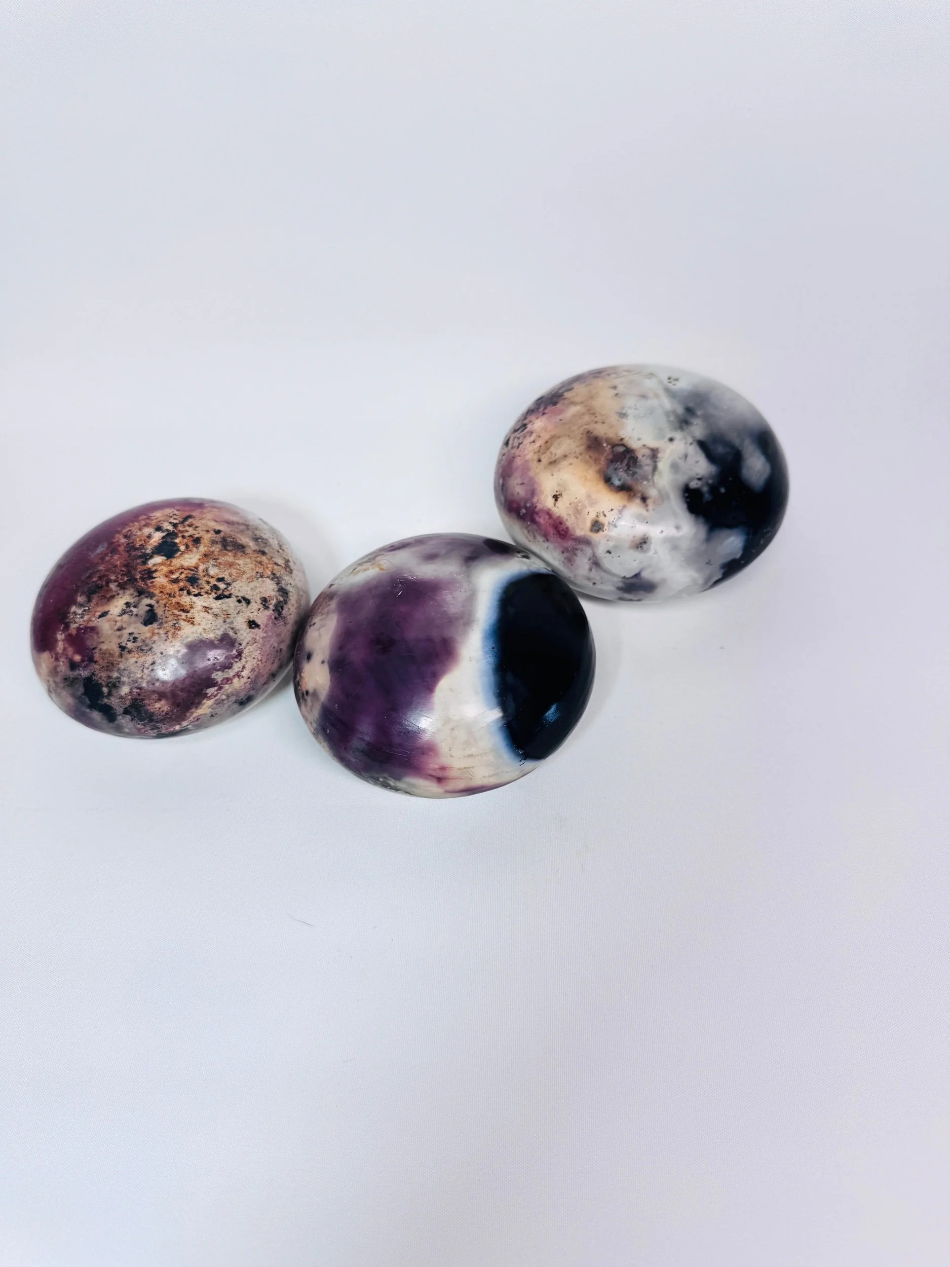 These 3 hollow decorative ceramic stones have been handmade & polished. They were fired for one week in a wood fire kiln to bring out an array of amazing natural colours